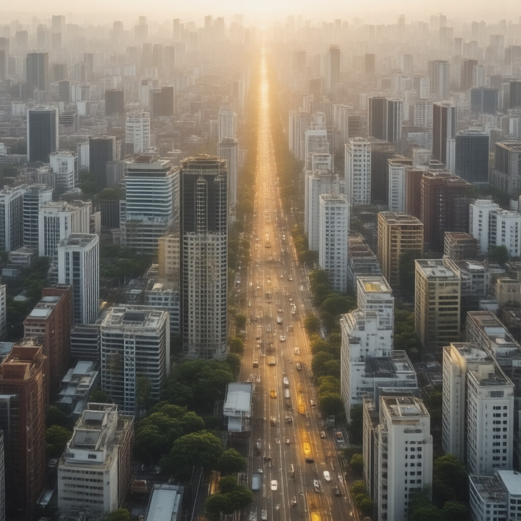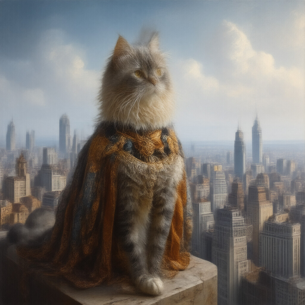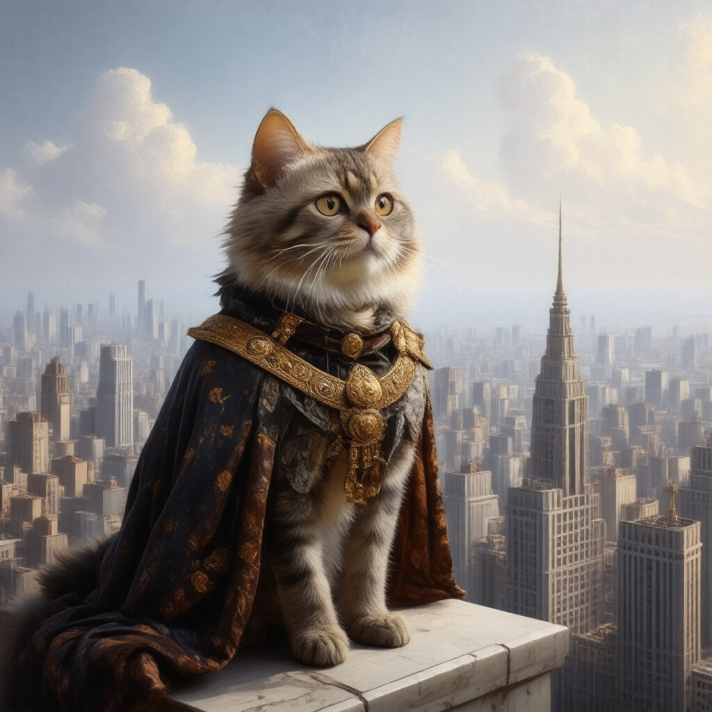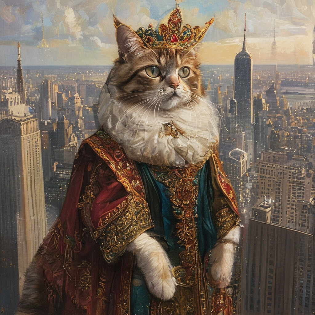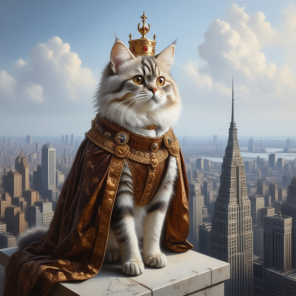 “A painting of a Persian cat dressed as a Renaissance king, standing on a skyscraper overlooking a city.”