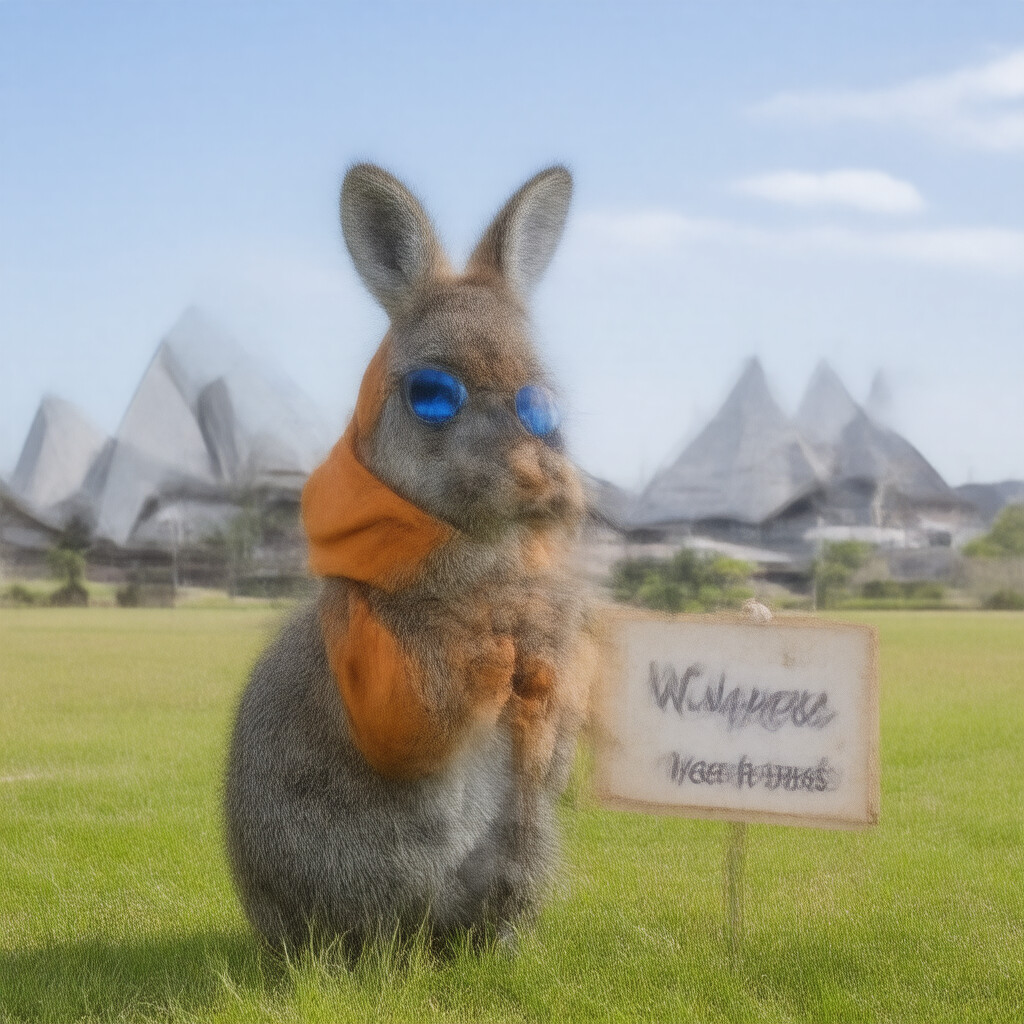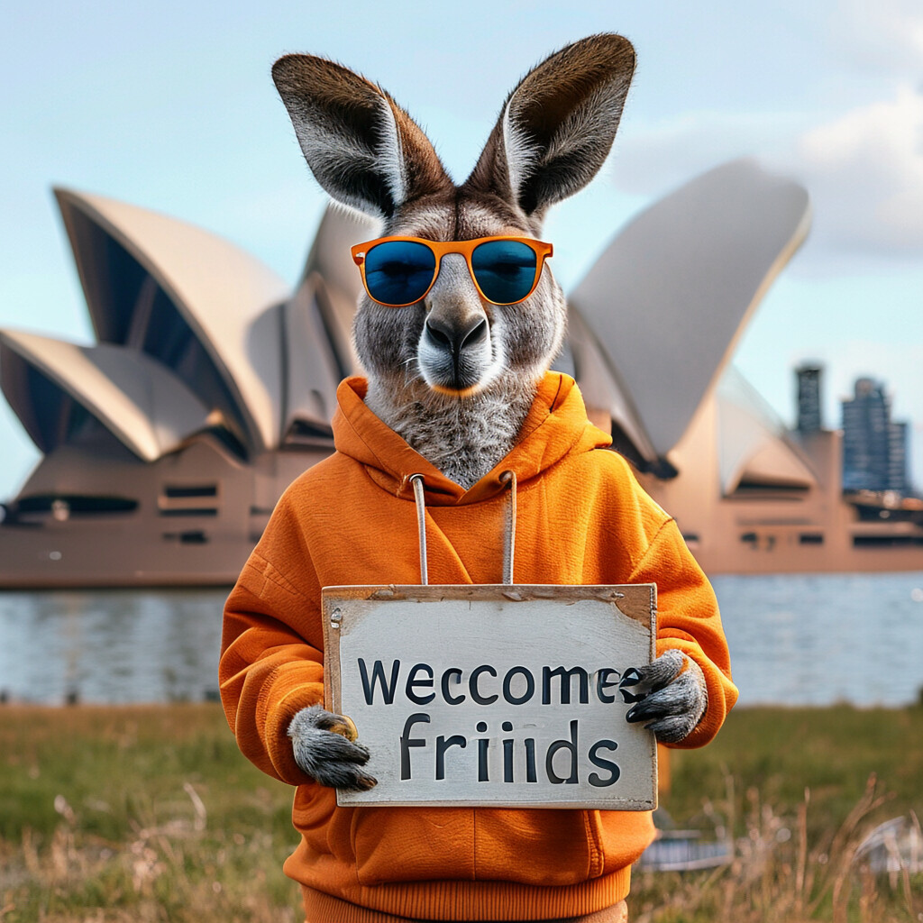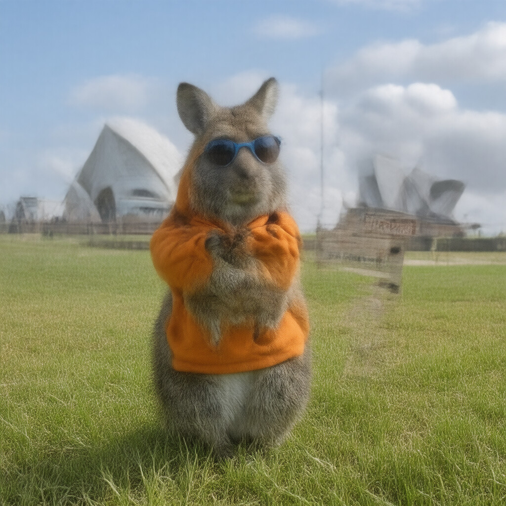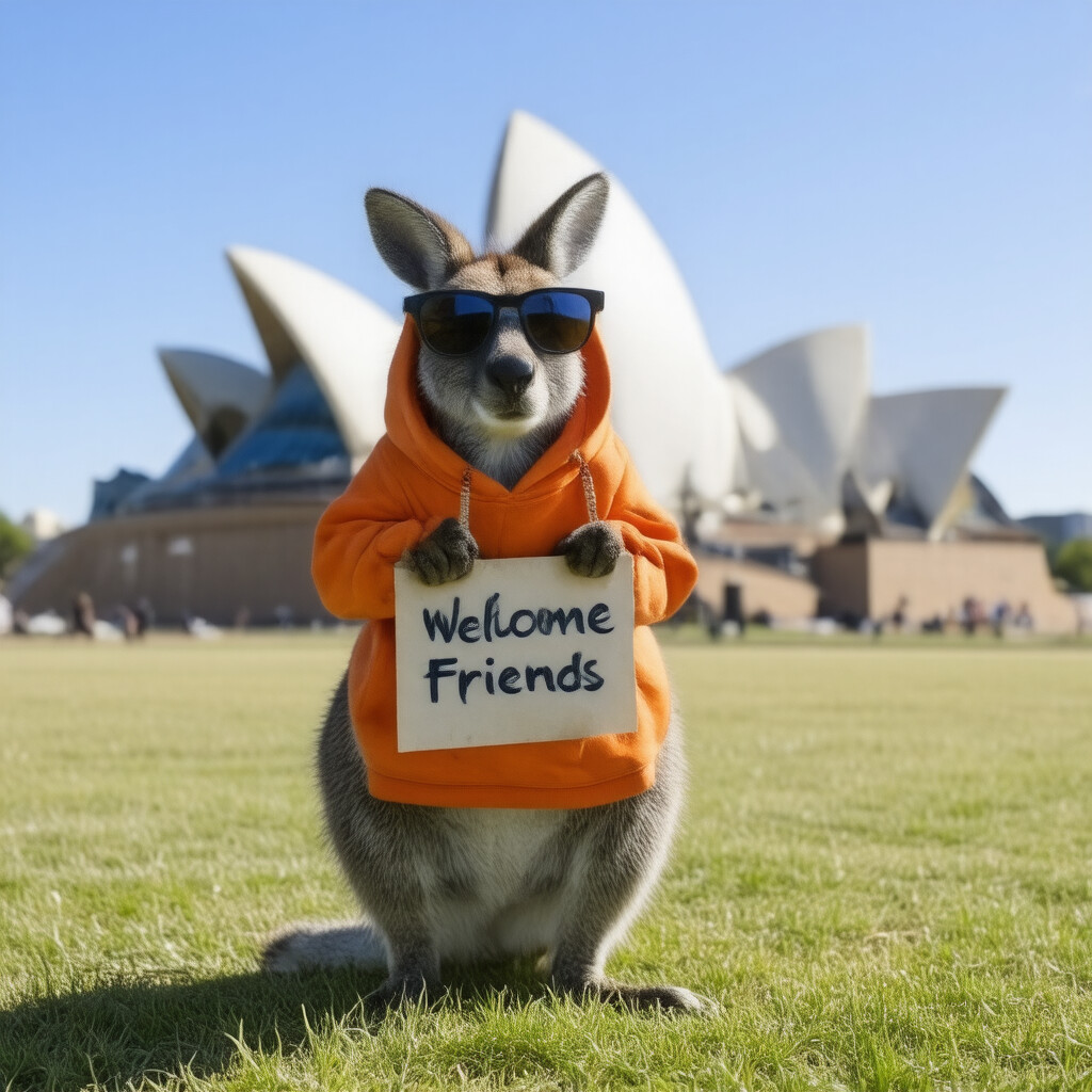 “A kangaroo in an orange hoodie and blue sunglasses stands on the grass in front of the Sydney Opera House”