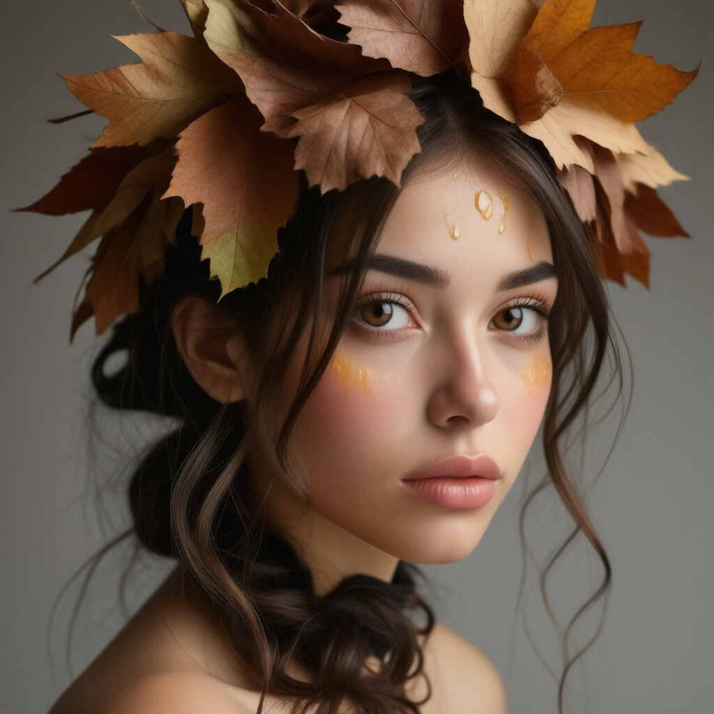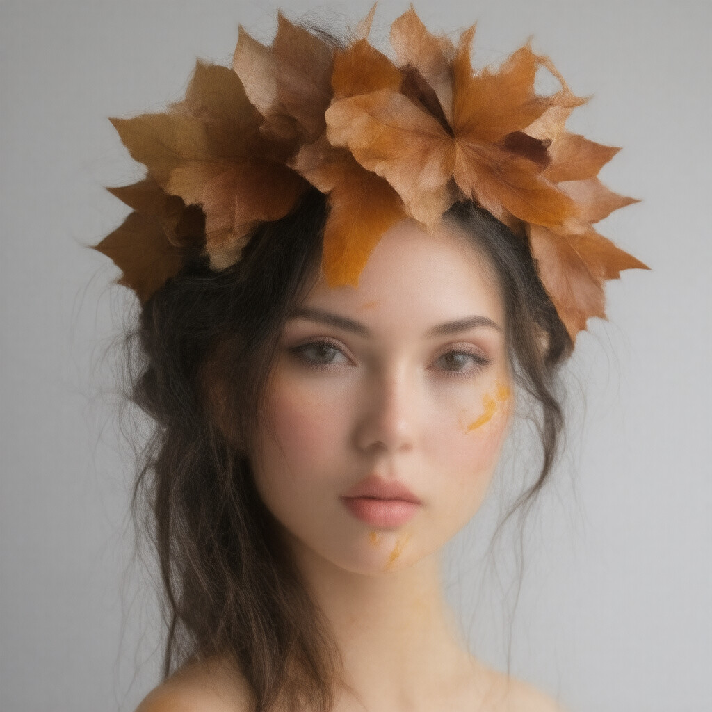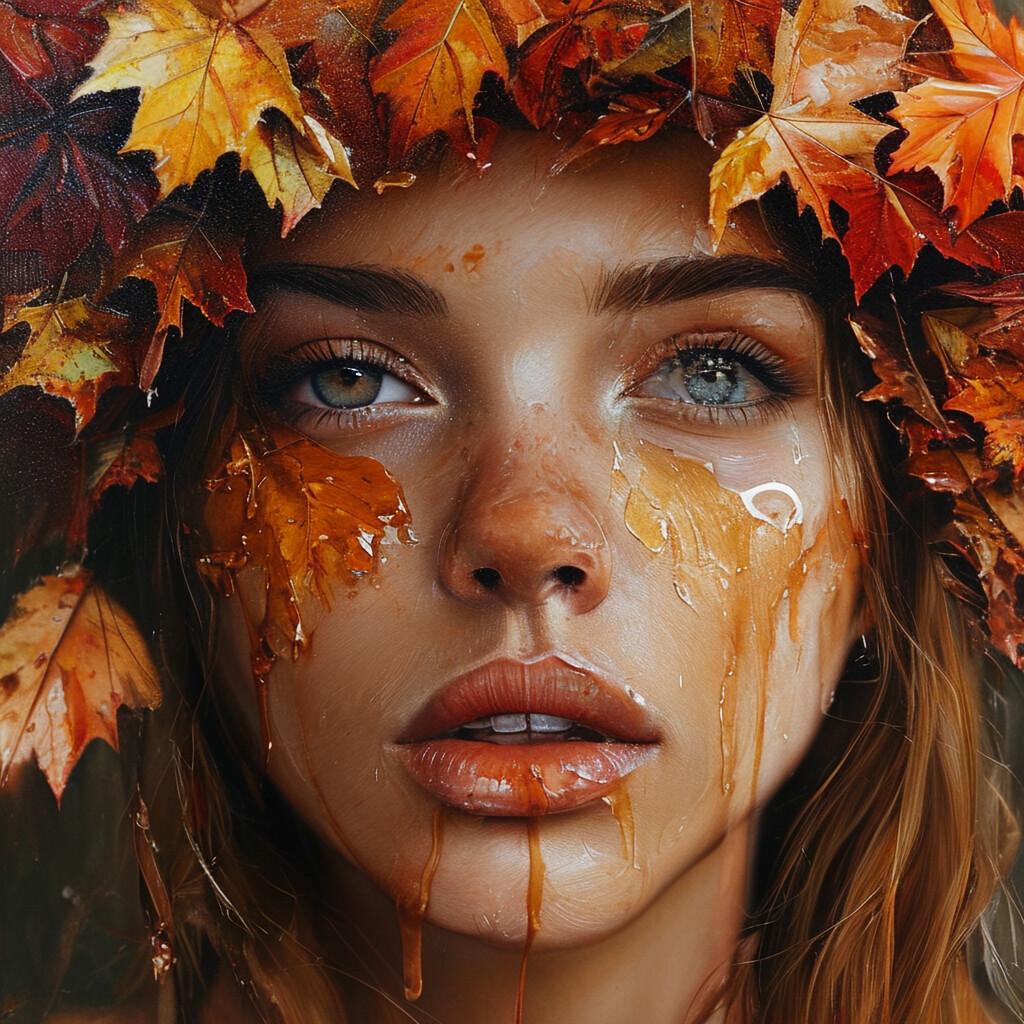 “A close-up portrait of a beautiful girl with an autumn leaves headdress and melting wax.”