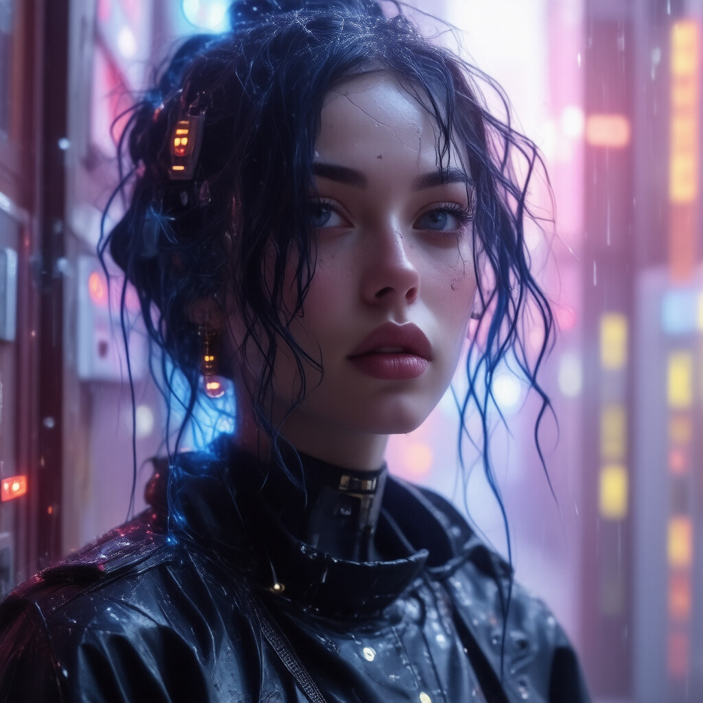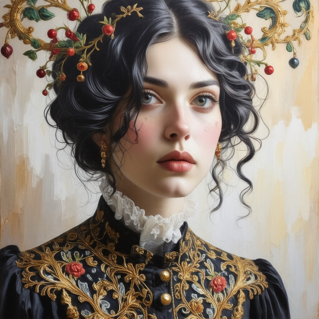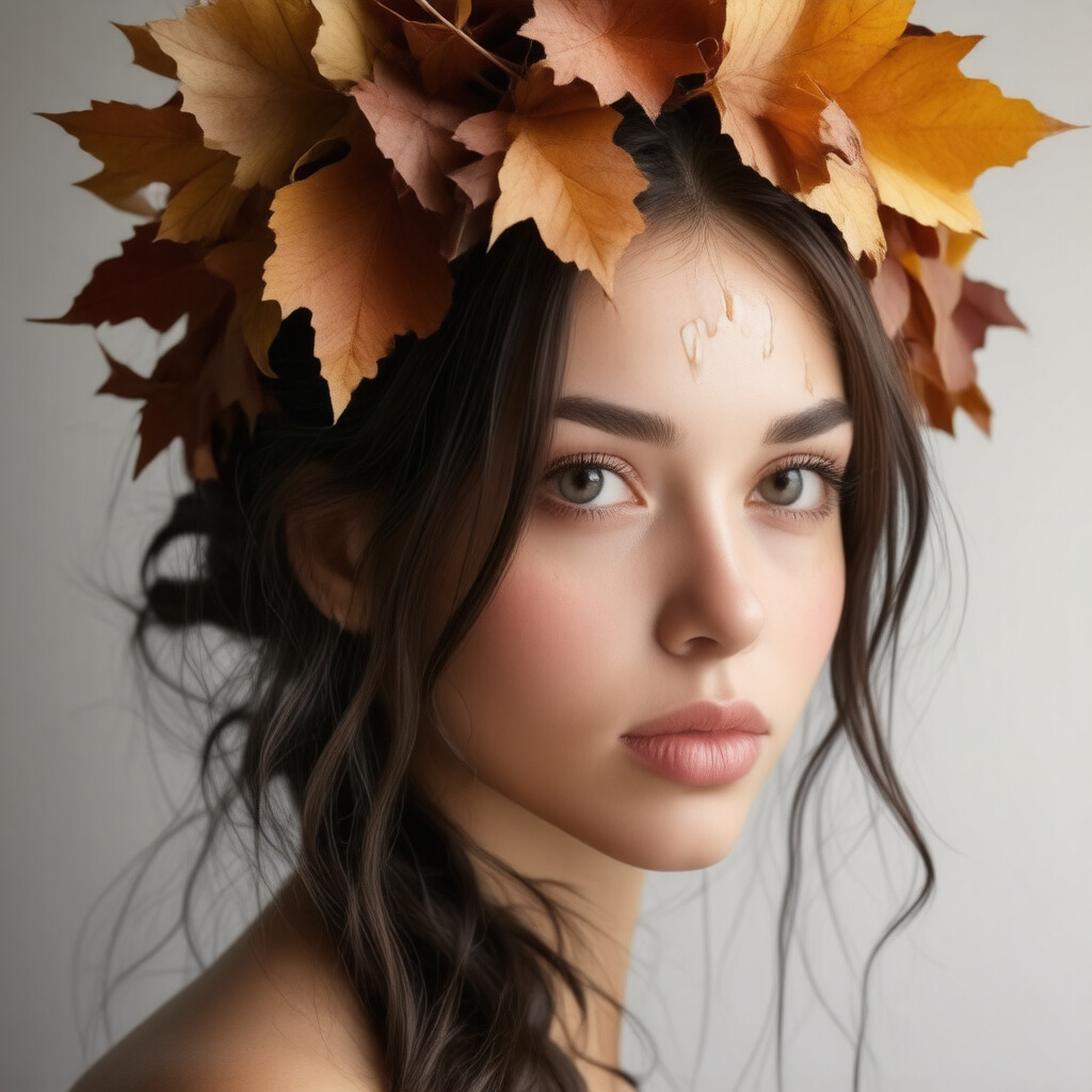 “A close-up portrait of a beautiful girl with an autumn leaves headdress and melting wax.”