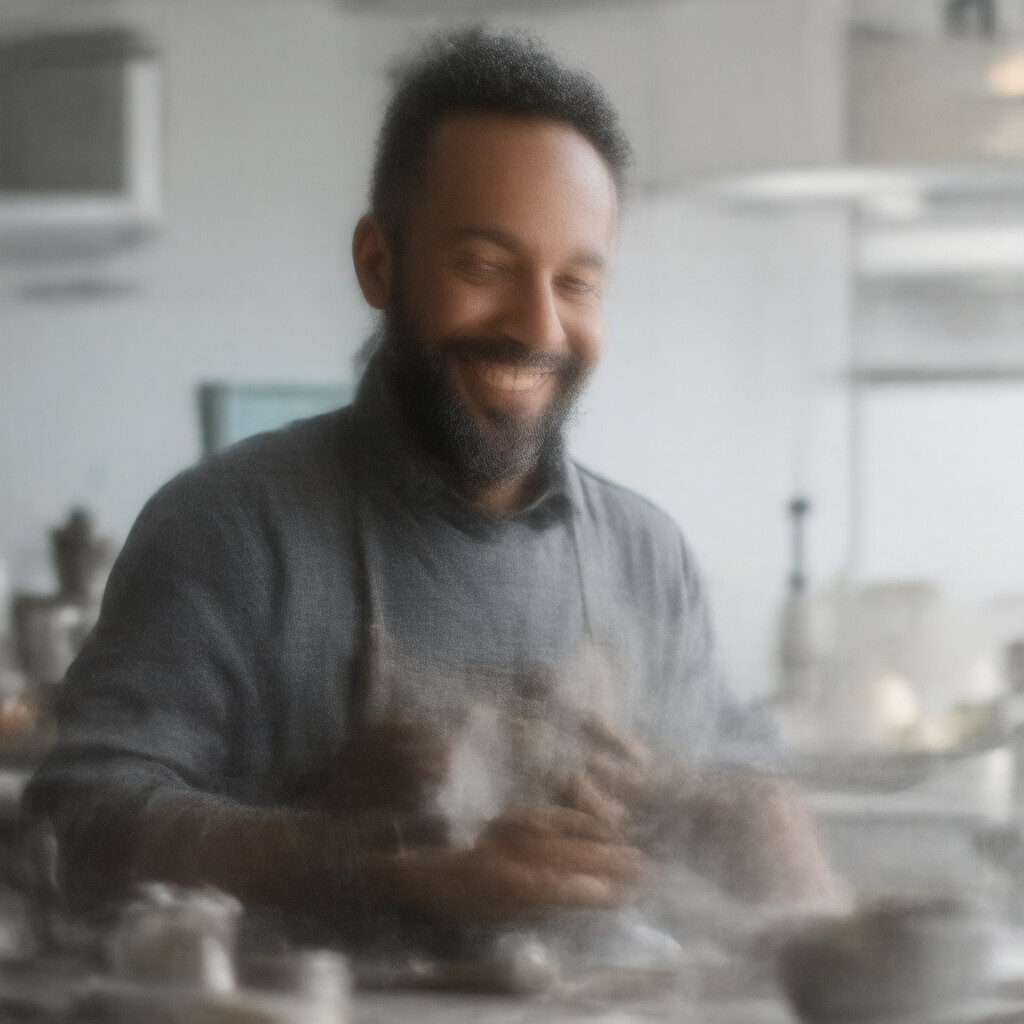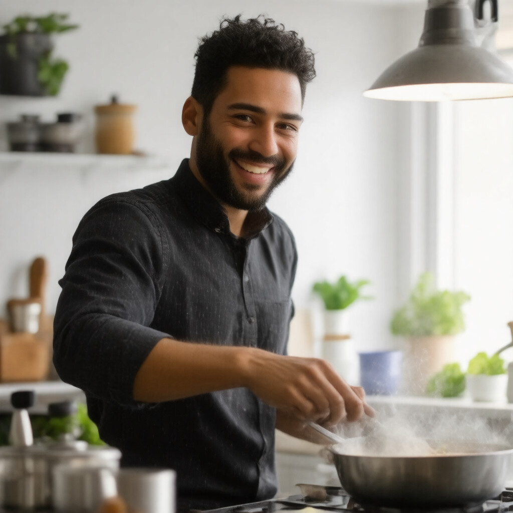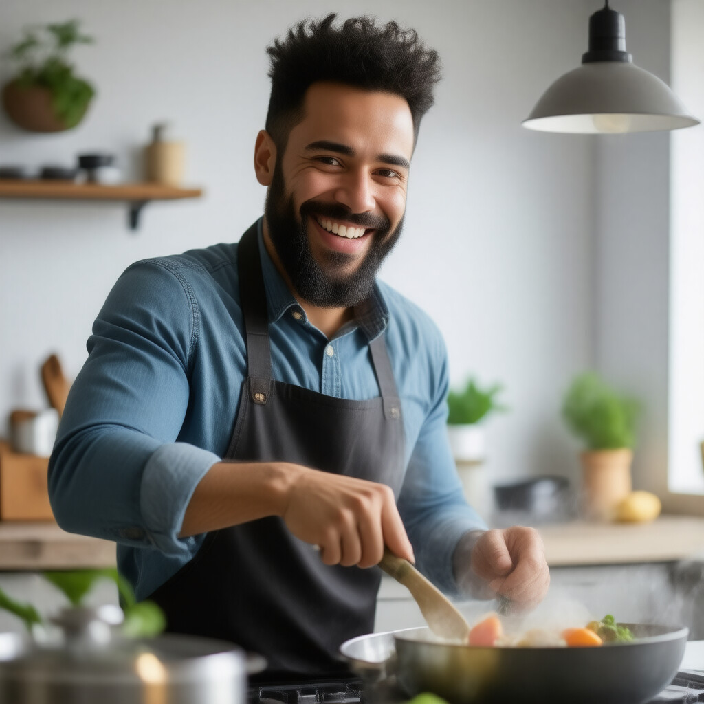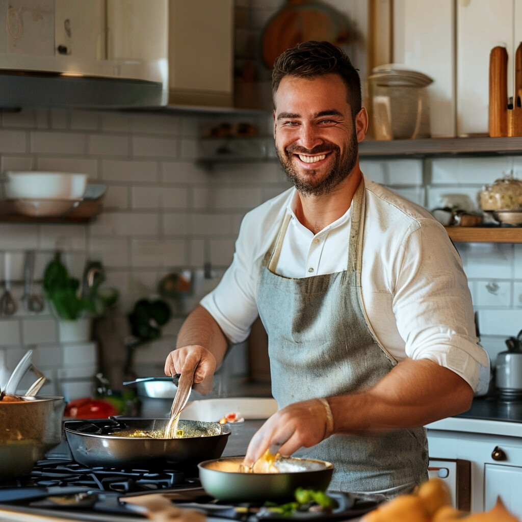 “A smiling man is cooking in his kitchen.”