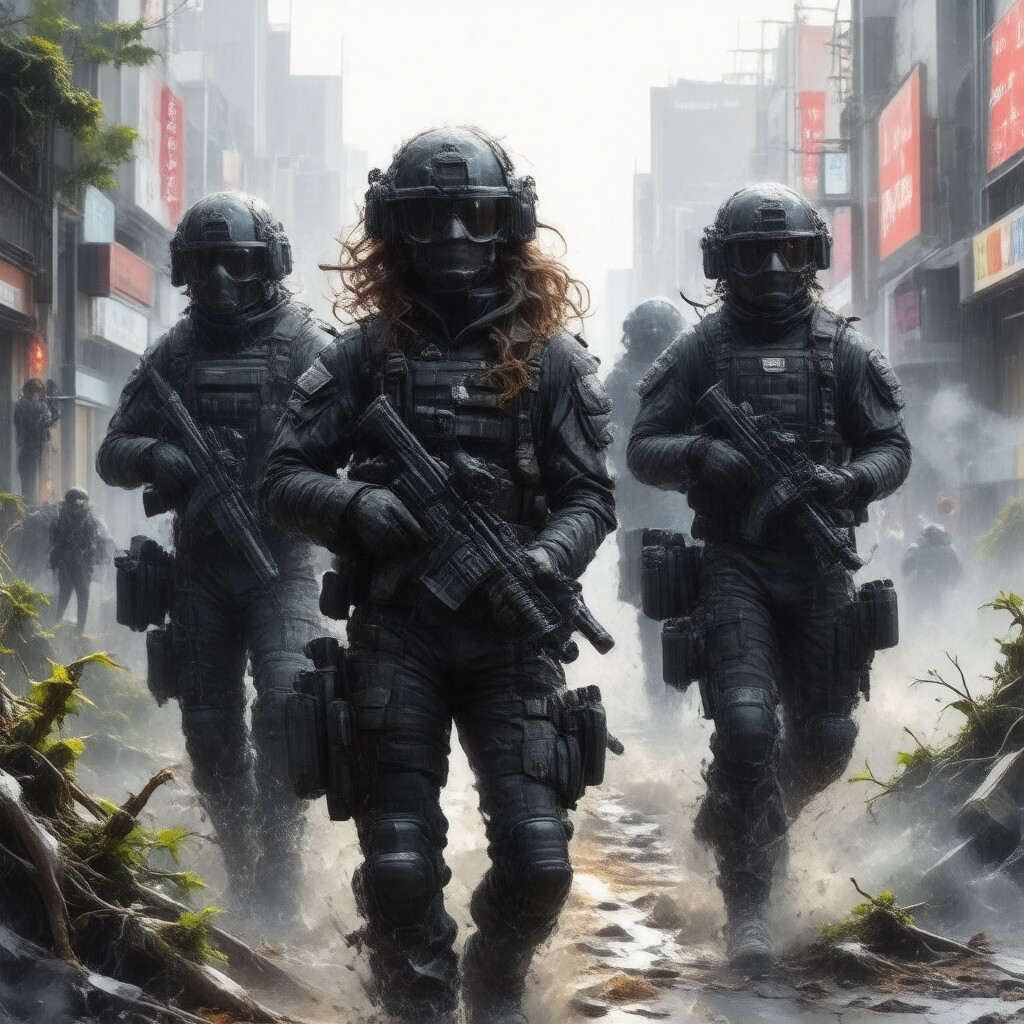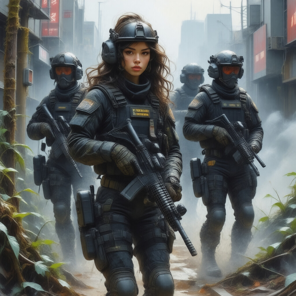 “A digital illustration of a beautiful and alluring American SWAT team in dramatic poses”